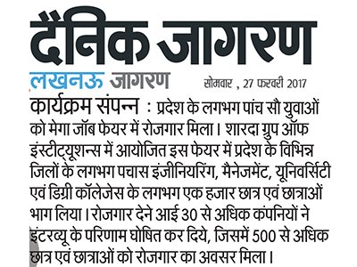 A Second Grant Job fair was organized by Sri Sharda Group of Institutions, Lucknow on 25 February 2017 at the college campus and it was more magnificent as compared to last year. More than 1000 students participated from 60+ Engineering, Management Colleges & Degree colleges across Lucknow and nearby locations where more than 500 students got the placements in 30+companies. Companies like Gyan Milk, Eureka Forbes, ICICI Prudential, Aegis etc were present in the fair. There was a free entry in the job fair so that students from various segments of the society could participate in the event. Our job fair provided a platform to the various students and HR of the various reputed companies so that they can interact with each other in a very cost effective way and companies also recruited the required talent without going through the hassle of traditional hiring practices.